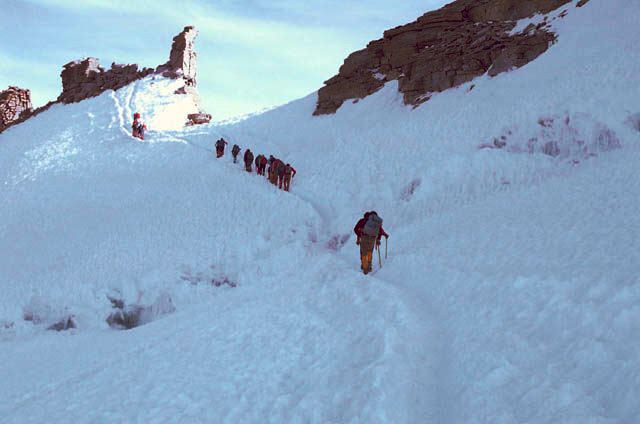 Per la prima volta saliamo accodati ad altri escursionisti su una montagna di 4000 metri, il Gran Paradiso, da Pont in Val Savaranche al rifugio Vittorio Emanuele ed alla vetta, dove c'e' una piccola Madonna ed un impressionante precipizio sul versante che guarda la Val di Cogne.