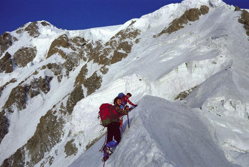 Su un aerea crestina di ghiaccio nel pieno dello sperone della Brenva al Monte Bianco.La giornata e' stupenda, l'ambiente selvaggio.In questa giornata dopo aver raggiunto la vetta andremo vicini allo sfinimento.Ma per compiere questa scalata non basta la forma fisica.Ci vuole il cuore.