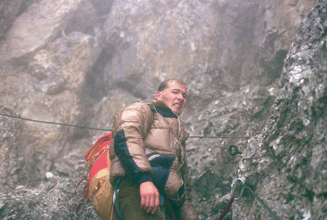 Sulla via "Bolver Lugli (ex Highusi)" al Cimon della Pala sulle Pale di S. Martino.La giornata e' drammatica, piove a dirotto nella nebbia.Saltiamo la vetta e sulla spalla ci fermiamo al bivacco Fiamme gialle cacciando alcuni tedeschi, poi al rifugio Rosetta.Qualcuno dopo questo giorno non tornera' piu' in montagna.