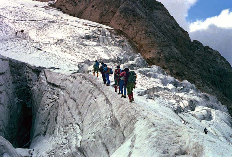 Sul bordo di un crepaccio lungo la discesa dalla Mrmolada.