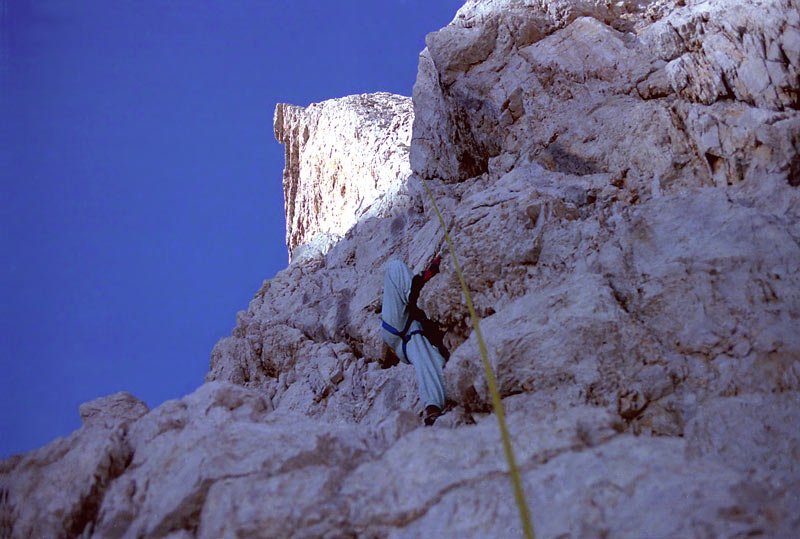 All' attacco della via normale del Campanile basso, Il Sole illumina la cima.Piu' avanti saliremo (con ogni mezzo) il camino Scotoni fino alla cengia e poi per la via Preuss in vetta.