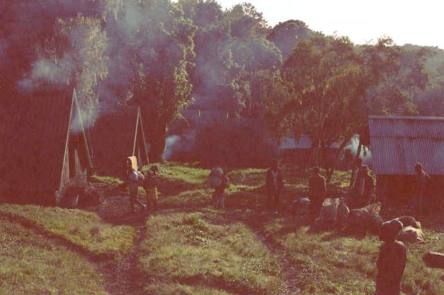 Kilimanjaro 1982.Si sveglia il campo alle prime luci dell' alba, si accendono i fuchi per la colazione, si preparano i carichi e gli zaini e poi si parte verso il rifugio Horombo.