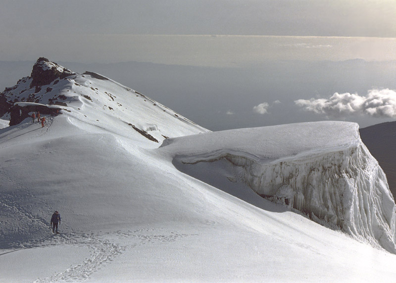 Sulla calotta sommitale del Kilimanjaro, tra la Gillmans point e l' Uhuru peak,lungo il bordo innevato del cratere, con le sue bizzarre formazioni di ghiaccio.Siamo sul tetto dell' Africa, sotto di noi le immense savane.La fatica a questa quota e' immensa.Questo e' il punto dove abbandona e si volge al ritorno, chi ha solo la forza delle gambe ma non e' motivato.