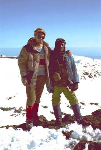 E' l'ultimo dell' anno del 1982 e finalmente dopo un ascensione faticosissima mi faccio ritrarre con la nostra guida sulla vetta piu' alta del Kilimanjaro, l' Uhuru peak mt. 5895 ( ex punta Kaiser Wilhelm).La grande fatica e' finita, lungo la discesa faro' lo slalom tra la cenere vulcanica.