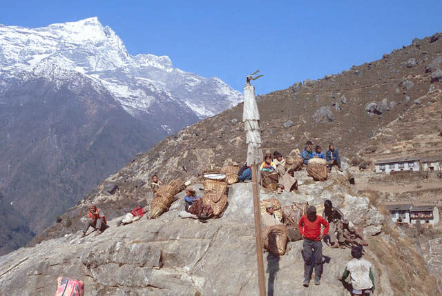 Nepal 1984.E' sabato a Namche Bazar, la capitale degli Sherpa nella valle del Kumbu (Everest).Dai villaggi della regione la gente affluisce a Namche per il mercato, attraverso i sentieri che intagliano le pendici delle montagne.