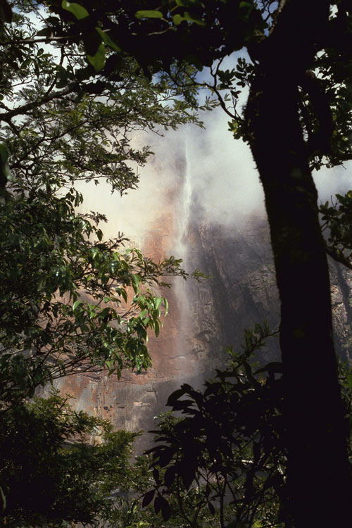 Tra le fronde durante il percorso compare la cascata piu' alta del mondo.L' acqua e' poca in questa stagione ed al fondo arriva nebulizzata.