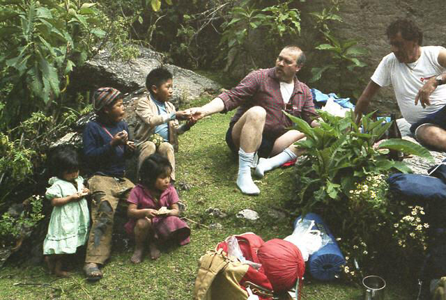 Il Baffo attorniato dai bambini durante la prima sosta del tekking.Forse l' hanno scambaito per Babbo Natale.