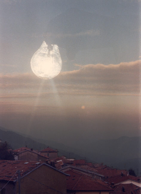 19/20-10-1987.Esposizione doppia con una pellicola da 200 A.Per la prima esposizione ho inquadrato la lampadina contro il Sole chiudendo al massimo il diaframma con un tempo di 1/1000, (si nota la sagoma della mano).La seconda esposizione riguarda lo sfondo, usando un tempo di 1/60 con diaframma 8.