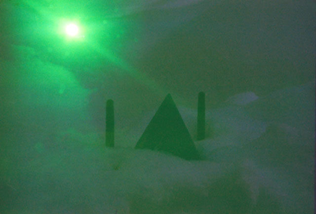 22-02-1996.Esposizione doppia eseguita con una pellicola da 400A. 1° exp.Sole con filtro verde, tempo 1/1000 e diaframma 22. 2° exp.Oggetti sulla neve, tempo 1/1000 e diaframma 22.Si noti la grana dovuta all' alta sensibilita' della pellicola.