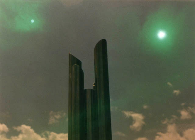 15-05-1986.Fotografia multipla eseguita con una pellicola Kodak da 100A.I primi due scatti hanno riguardato i soli con il diaframma regolato al minimo (16) e con l' uso di un filtro verde.Il terzo scatto ah avuto come soggetto il manufatto metallico sullo sfondo delle nuvole, sempre con il diaframma minimo.