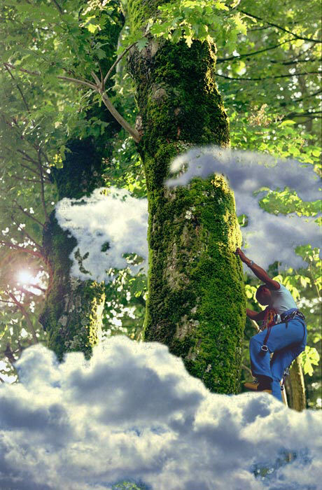 22-02 / 17-05-1998. composizione formata da quattro fotografie distinte e cioč gli alberi, il soggetto che arrampica , e due foto di nuvole. Le varie riprese sono state poste su diversi livelli ed elaborate , quindi fuse insieme. Ho anche usato diversi filtri per le sfumature e gli effetti di luce.