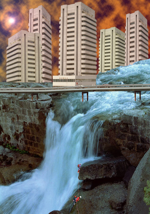 02-05-1998. Elaborazione digitale dal 07-08-1998 al 04-03-2000, di tre diverse fotografie; la cascata come sfondo, i grattacieli e gli alpinisti. Il tutto fuso ed amalgamato, con la relativa creazione di illuminazione ed ombre.