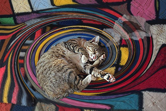 06-04 / 20-04-1997. composizione di due foto : il gatto che dorme sul divano ed il merlo. Ho posizionato le varie immagini su diversi livelli per la elaborazione e l' applicazione dei filtri per creare il movimento sotto il gatto e per fondere il fumetto in cui e' contenuto il merlo.