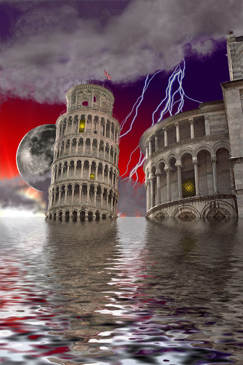 Foto scattata a Pisa il 02-05-2004 con pellicola kodak da 100 asa. Ho utilizzato il filtro "flood" di flaming pear ,per creare lo specchio d' acqua nel quale si immergono i monumenti, Con altri filtri ho creato i fulmini e la luna. Per amalgamare i vari livelli dell' elaborazione e' stato necessario un paziente lavoro di ritocco dei minimi particolari.