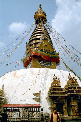 31-03-1984.Il tempio principale di Katmandu, detto di Swaiambuinat, si trova sulla sommita' di una collina dominante la valle di Katmandu, ed e' raggiungibile solo per mezzo di due lunghissime scalinate, gremite di scimmie, fedeli e mendicanti.