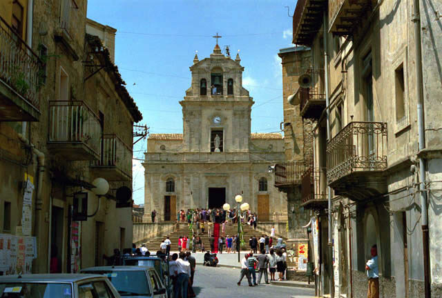 26-05-1990.Le ali degli edifici laterali indirizzano l' attenzione al sagrato della chiesa di Mirabella in Sicilia, nella quale sta per celebrarsi un matrimonio (il Borgia).