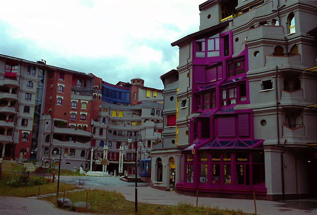 26-07-1991.Immagine di un quartiere moderno della citta di Ginevra, particolare per la colorazione delle facciate degli edifici.Per ampliare il campo visivo ho usato un obiettivo da 35 mm.