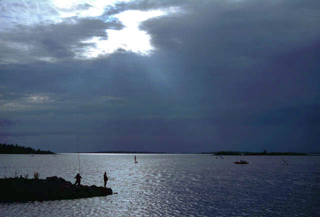 18-08-1993.Pescatori all' estuario del fiume Kemijoki, nel nord della Finlandia.Controluce eseguito con una pellicola da 100 A , un tempo di 1/1000 e diaframma 5,6.