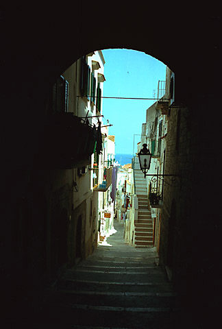 05-06-1995.I vicoli di Vieste nel Gargano, fotografati con una pellicola ad alta definizione da 25A.Il tempo dello scatto e' 1/60 ed il diaframma 8, per ottenere una profondita' di campo che comprenda il punto piu' distante del panorama.